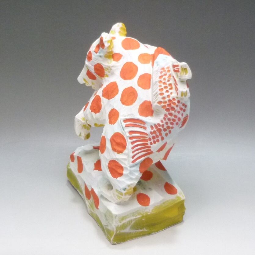 木彫りのクマに元気なオレンジドットが施され、明るく楽しい雰囲気を演出するアートです!この魅力的なデザインは、見る人に元気を与え、どんなインテリアにもぴったりとフィットします。特に子供部屋やリビング、オフィスのデコレーションアイテムとしておすすめです。