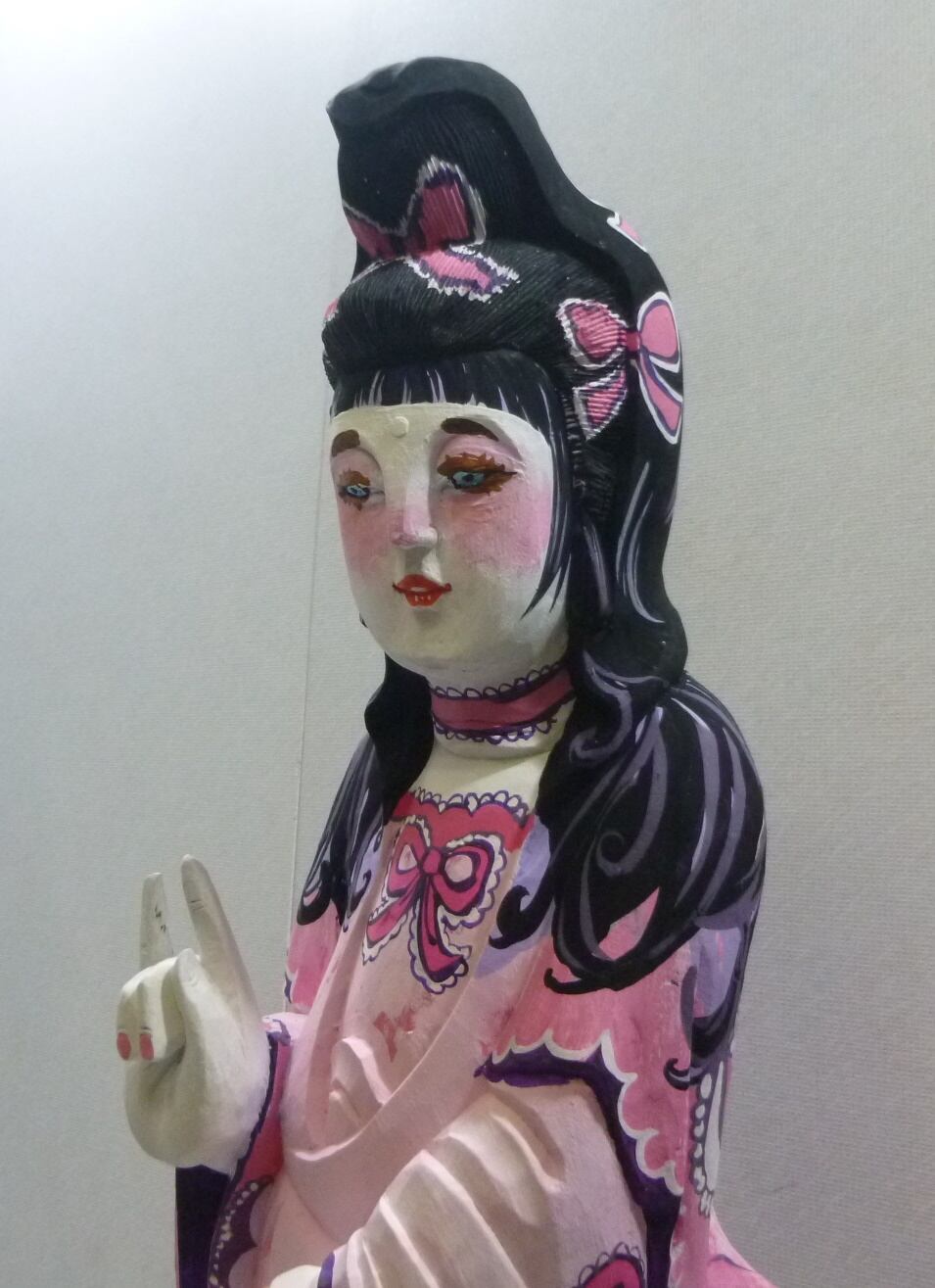可愛らしいロリータファッションをまとった木彫りの観音様が、ピンクの優しい色合いでアートの世界を彩ります!このユニークなデザインは、見る人に愛らしさと癒しを届け、どんなインテリアにも魅力的なアクセントを加えます。特に女性の部屋やカフェスペース、デコレーションを楽しむ場所におすすめです。
